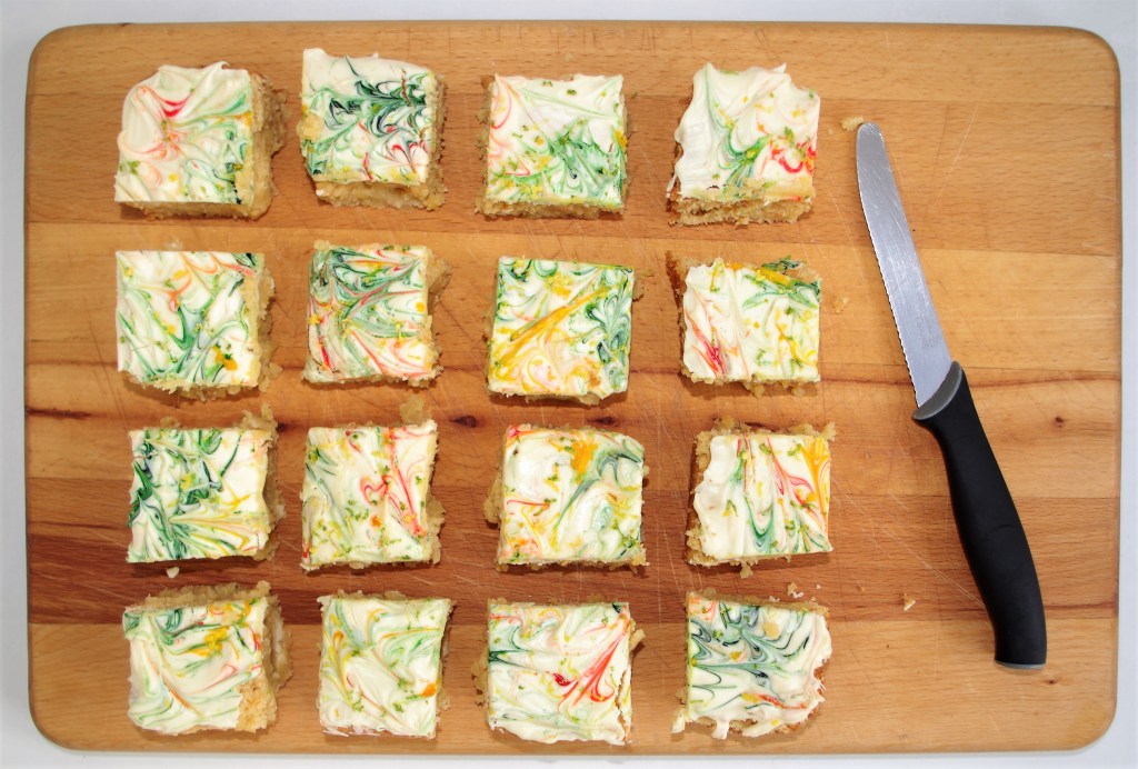 12. Brush off any crumbs from the blondie block then pour over the chocolate and spread it evenly. Working quickly, put small drops of colour randomly onto the chocolate. Use cocktail sticks – one per colour – to lightly drag the coloured drops over the surface to create a pleasing pattern. Take care not to dig too deeply.