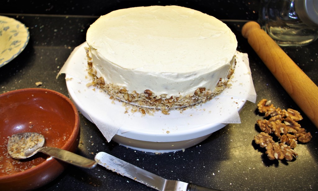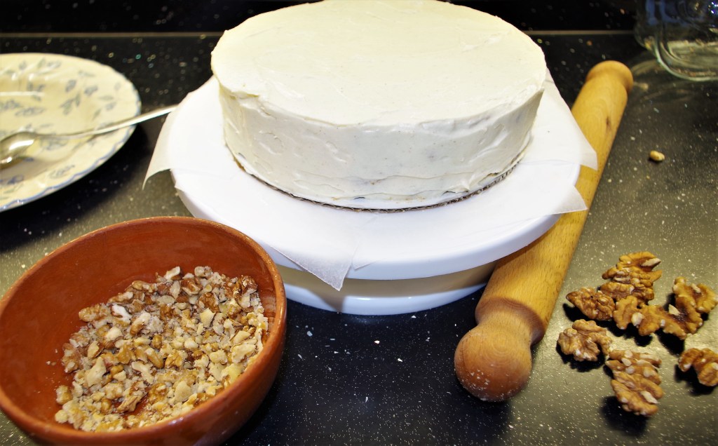 - Extra walnuts, crushed – if you want a border at the base of the cake