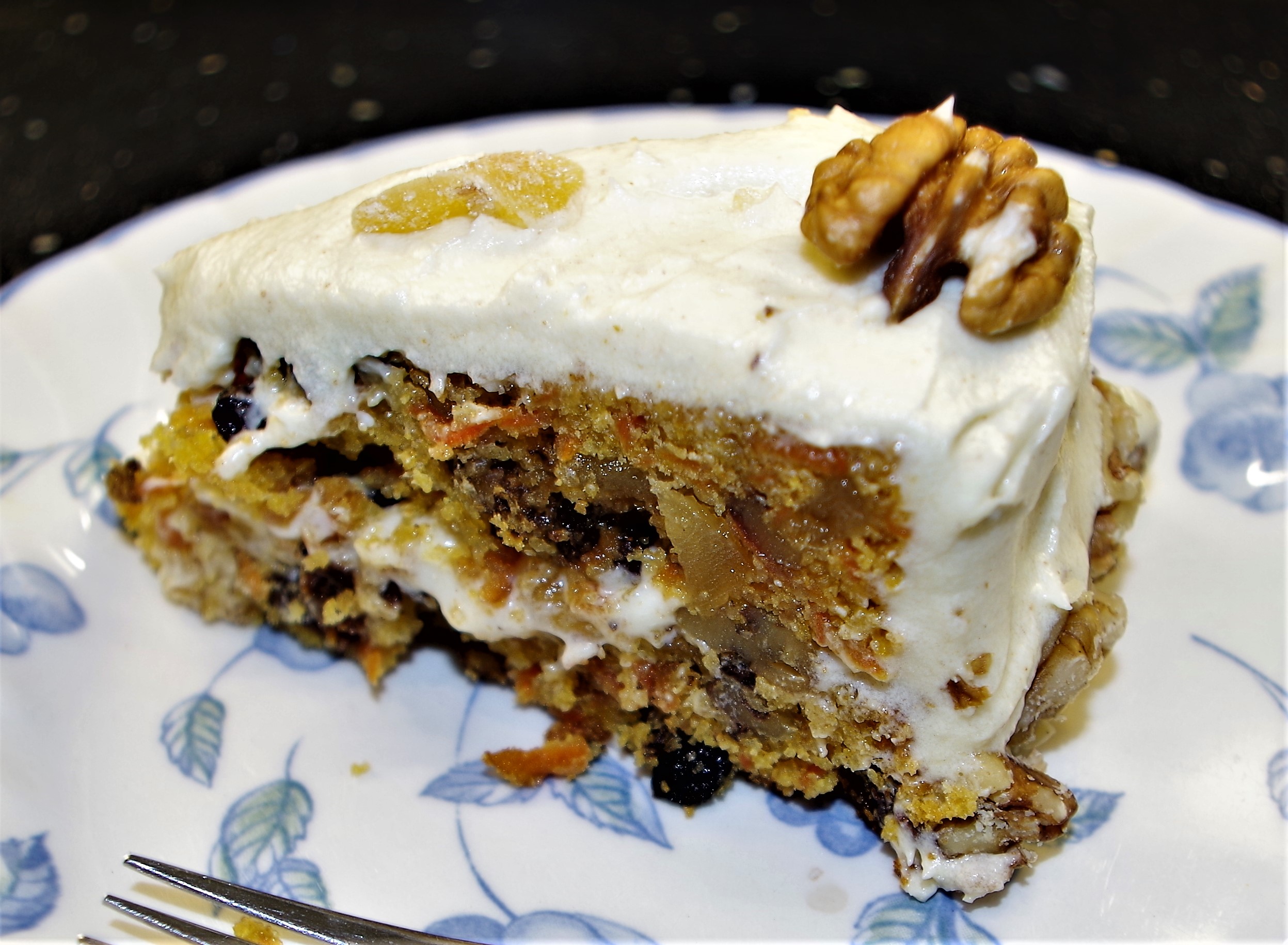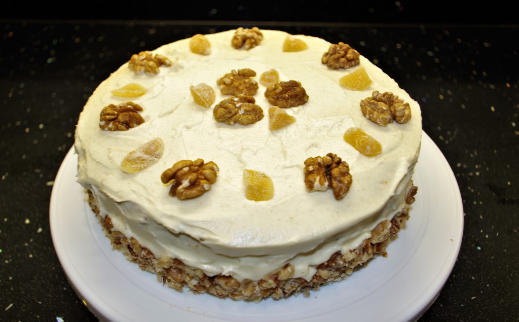 I’ve already posted a Loaf cake version of this, which is lovely. This equally lovely circular version has the same great flavour and crunchy texture and also a complete covering of rich cream cheese frosting.