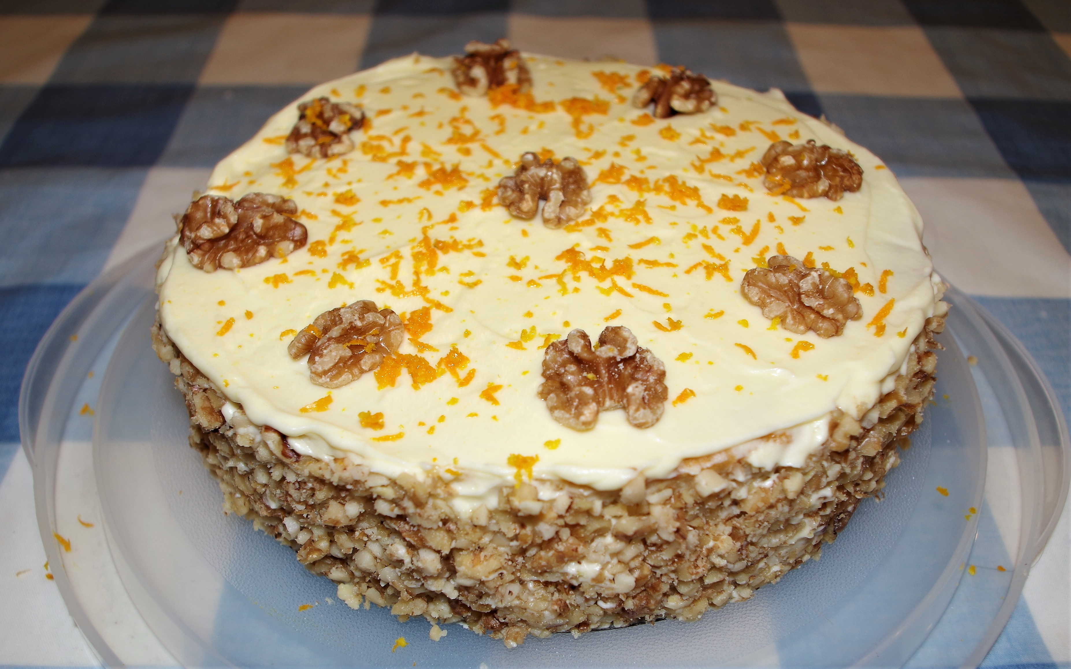 8. Spread the rest of the coating on the top and sides of the cake. Press the remaining 100g of crushed walnuts all around the sides. Place the walnuts halves on top however you wish then finish by adding the remaining orange zest.