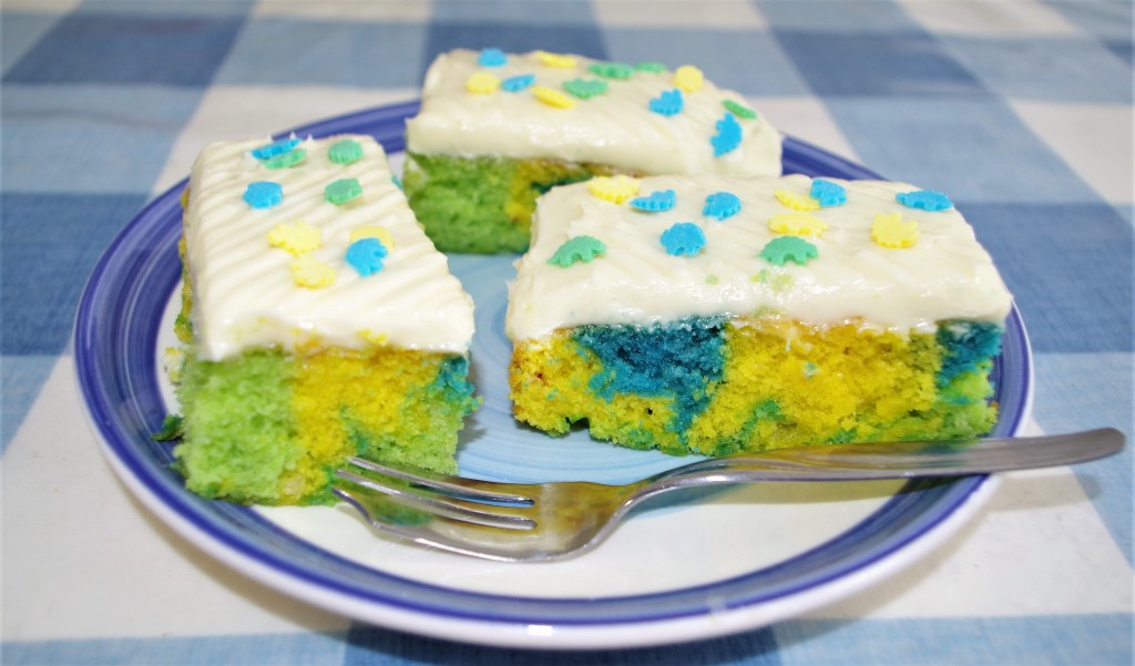 5. Put different coloured “blobs” randomly in the tin and gently swirl them using a chopstick or something similar, but don’t overdo this. Level the mixture and tap the tin on a work surface to release air and to fill the corners. Bake for around 30 minutes. Test by inserting a skewer into the middle. It will come out clean and dry if the cake is baked.