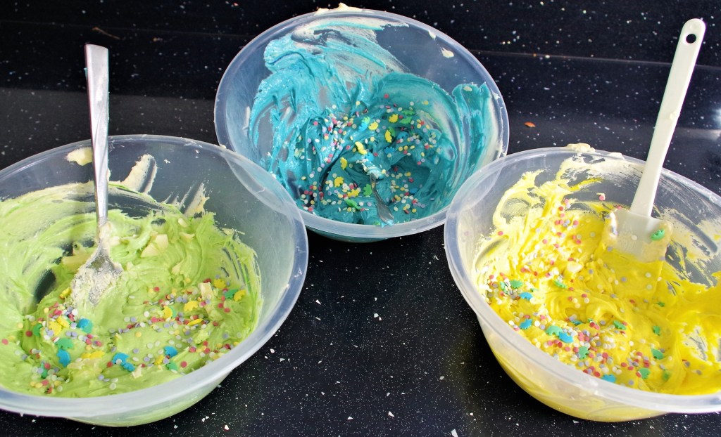 4. Divide the mixture into three bowls* and colour each one using the three food colourings. Stir equal amounts of white chocolate pieces and sprinkles into each mixture.