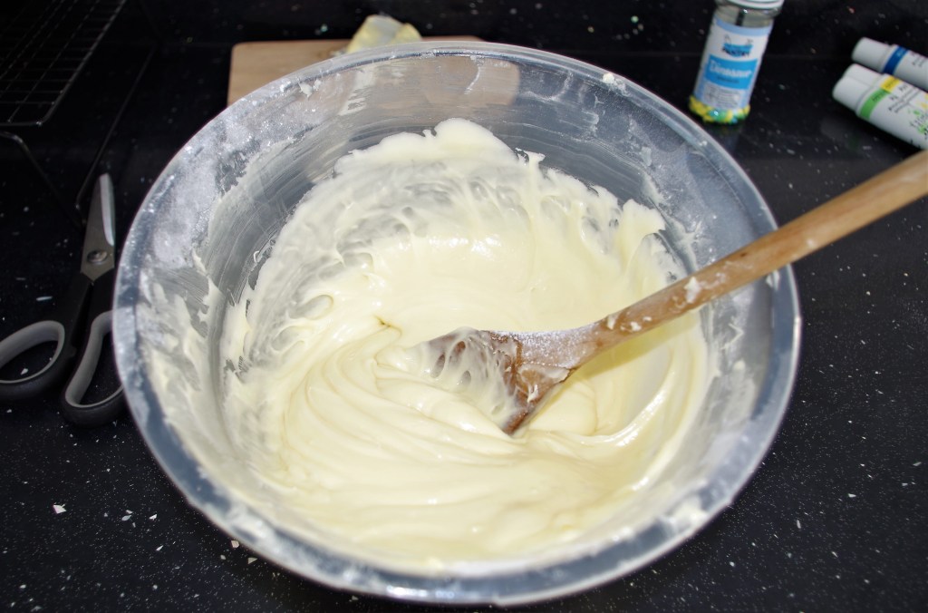 6. While it cools in the tin, make the topping. Melt the white chocolate over a bain marie. Beat the butter and cream cheese until creamy then sift over the icing sugar. Stir gently at first then beat more vigorously. Pour in the melted white chocolate and vanilla extract (if using) then beat some more. Put it in the fridge for a while to firm up.