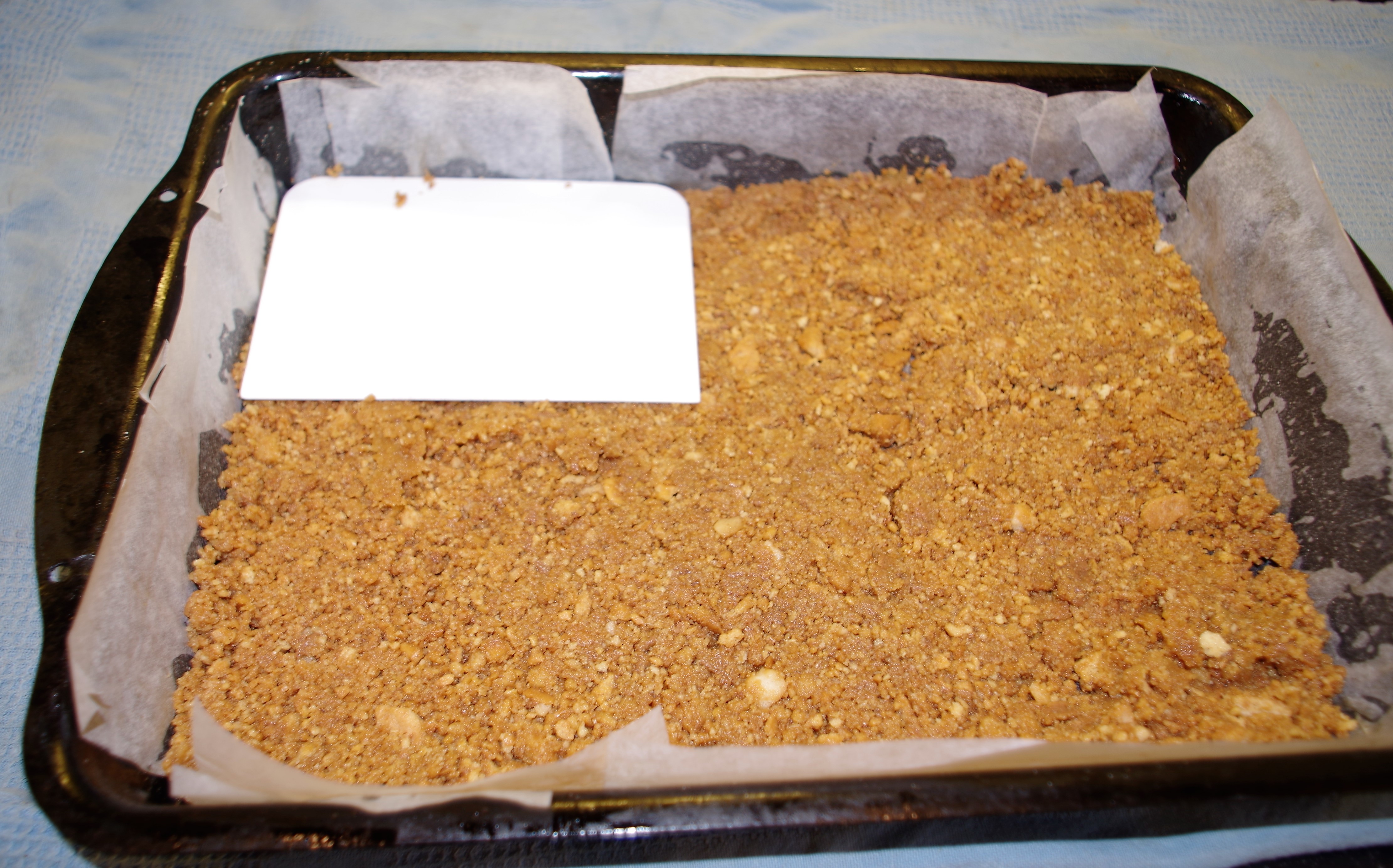 - Melt the butter then pour it onto the biscuit pieces. Mix to combine fully. Tip the mixture into the prepared tin and press down firmly. (I use a plastic dough scraper, flat. See photo below.) Put the tin in the fridge while making the caramel.