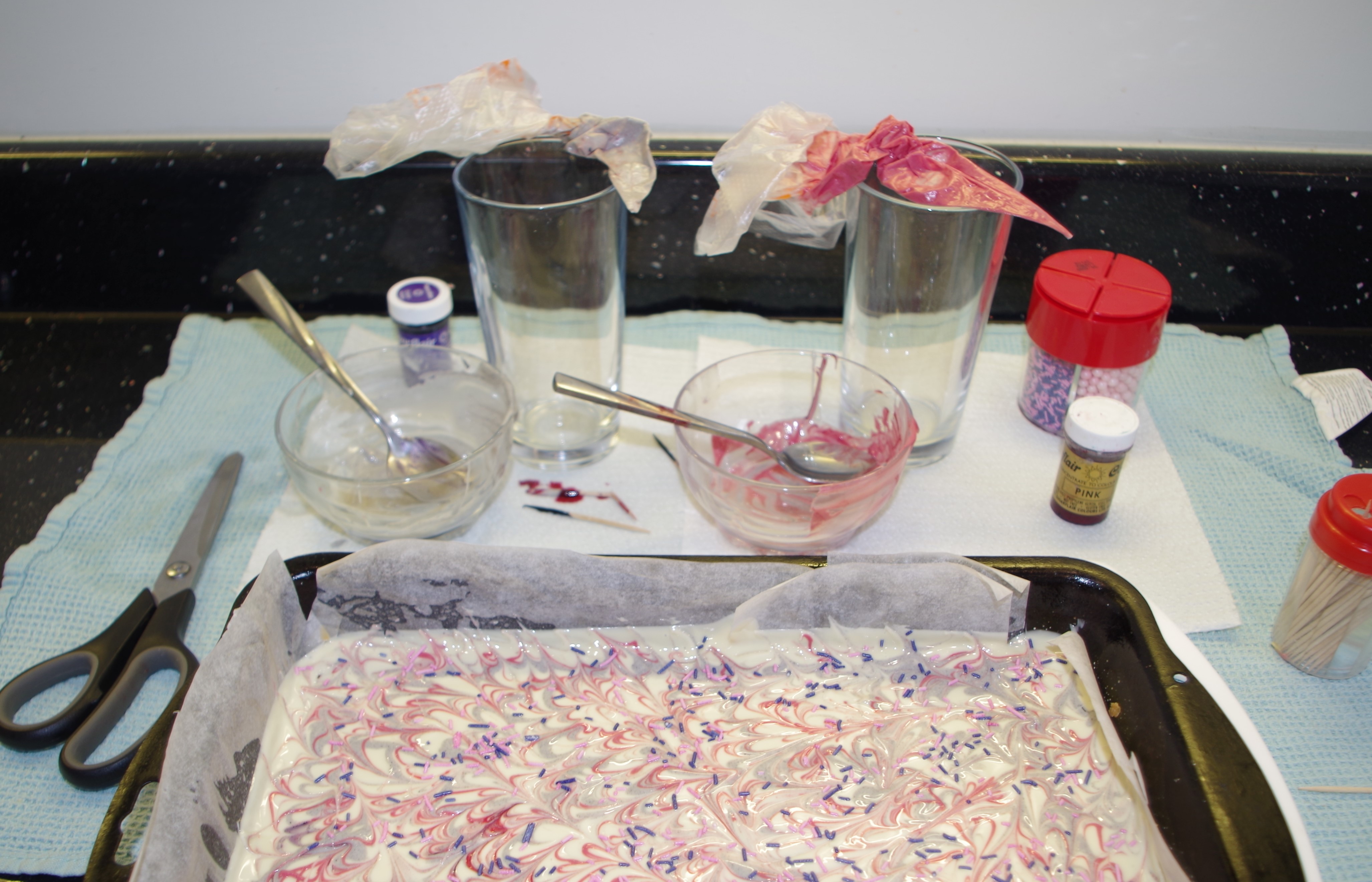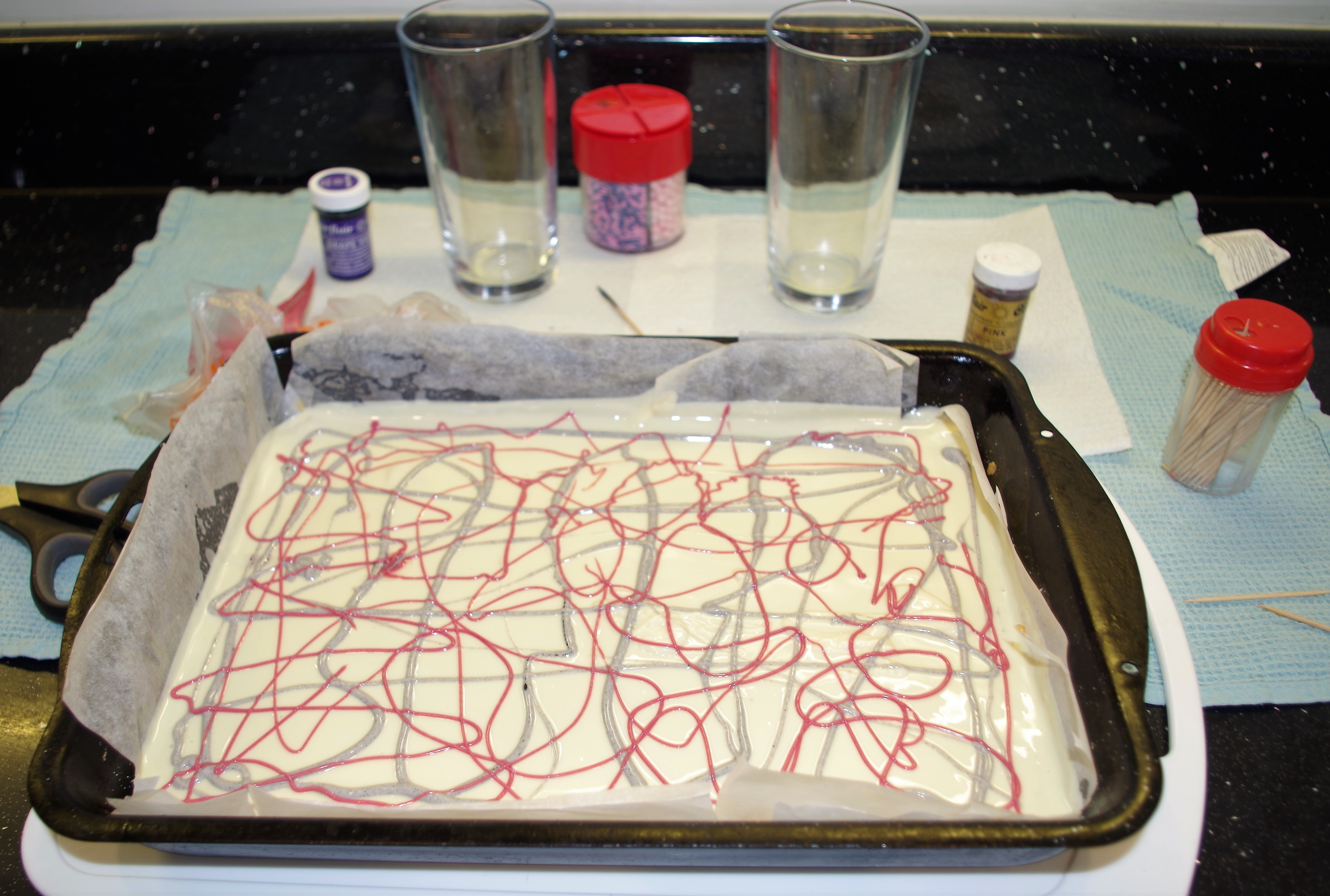- (Before beginning this stage you need to set out all your equipment in a logical way to avoid any wasted time once the chocolate has melted.) When the caramel has set, melt all the chocolate in a bain marie. Pour 60g into one or two small bowls (depending on how many colours you intend having). Pour the remainder onto the caramel layer and tip the tray again to spread it evenly. Working quickly, add your chosen colour or colours to the remaining chocolate and pour into one or two piping bags. Snip a very small hole in the bag and pipe random lines (circles work well too) over the white chocolate. Repeat, if using two colours. Gently drag the point of a cocktail stick over the coloured chocolate to create an attractive feathered effect.