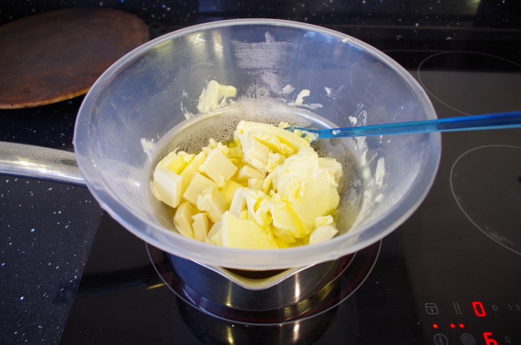2. Measure the butter and golden syrup into a small saucepan. Melt together over low heat and stir.