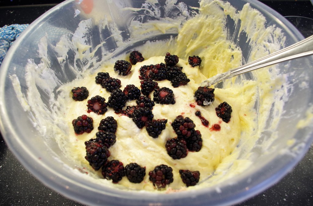 5. Gently stir in about 100g/3½oz blackberries, cut into halves or quarters (depending on their size).