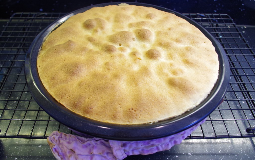 6. Spoon the mixture into the tin, spreading it evenly then bake for 30-35 minutes. When baked, leave in the tin for 10 – 15 minutes then turn out onto a wire rack to cool fully. (If the cake appears baked but not firmly set, keep it in the tin and place in the fridge until it’s firmer.)