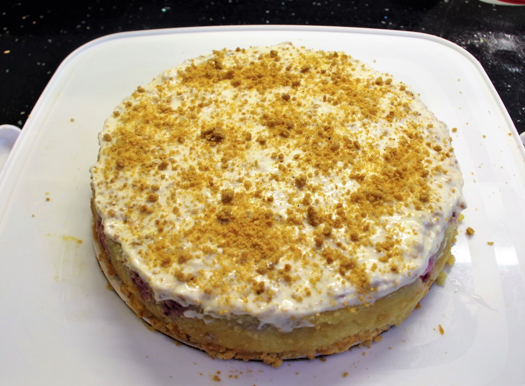 7. To decorate, briefly beat the cream cheese or mascarpone then sift in the icing sugar. Stir first then beat again. Stir in about three-quarters of the ginger biscuit crumbs. Spread this mixture evenly on top of the cake then sprinkle over some more biscuit crumbs and add the remaining whole blackberries.