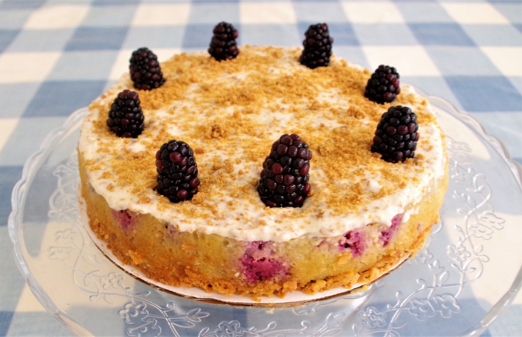 Here’s a rich and scrumptious cake that could also be a lovely dessert. White chocolate, ginger and blackberries together might be a bit “different”, but it’s a lovely tasty combination.