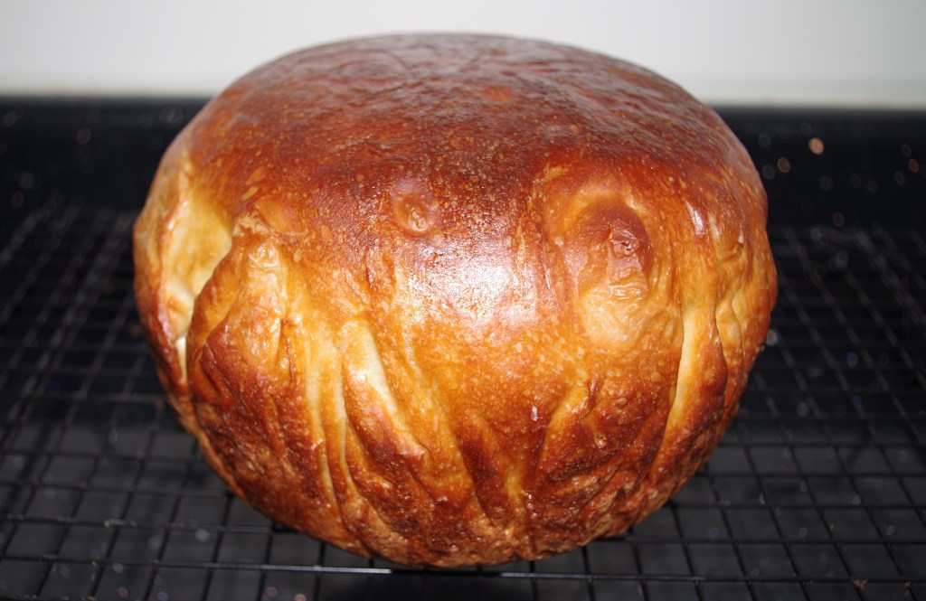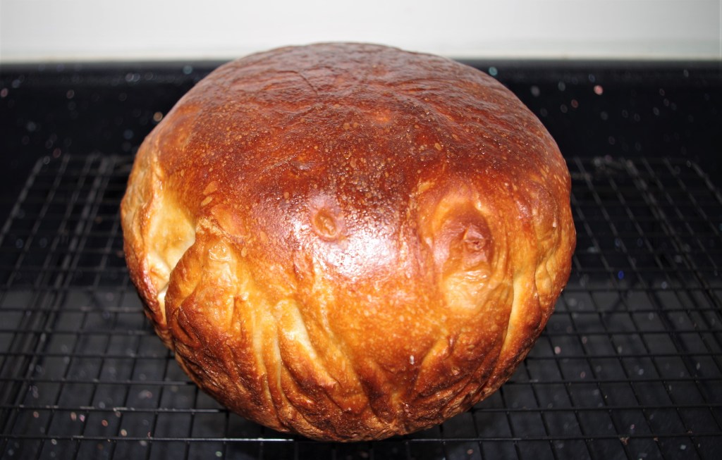 9. Remove the loaf from the Dutch oven. (If necessary, give it another 5 – 10 minutes upside-down on a rack in the oven to brown all over.)