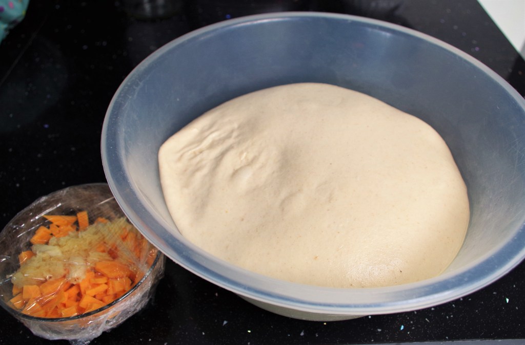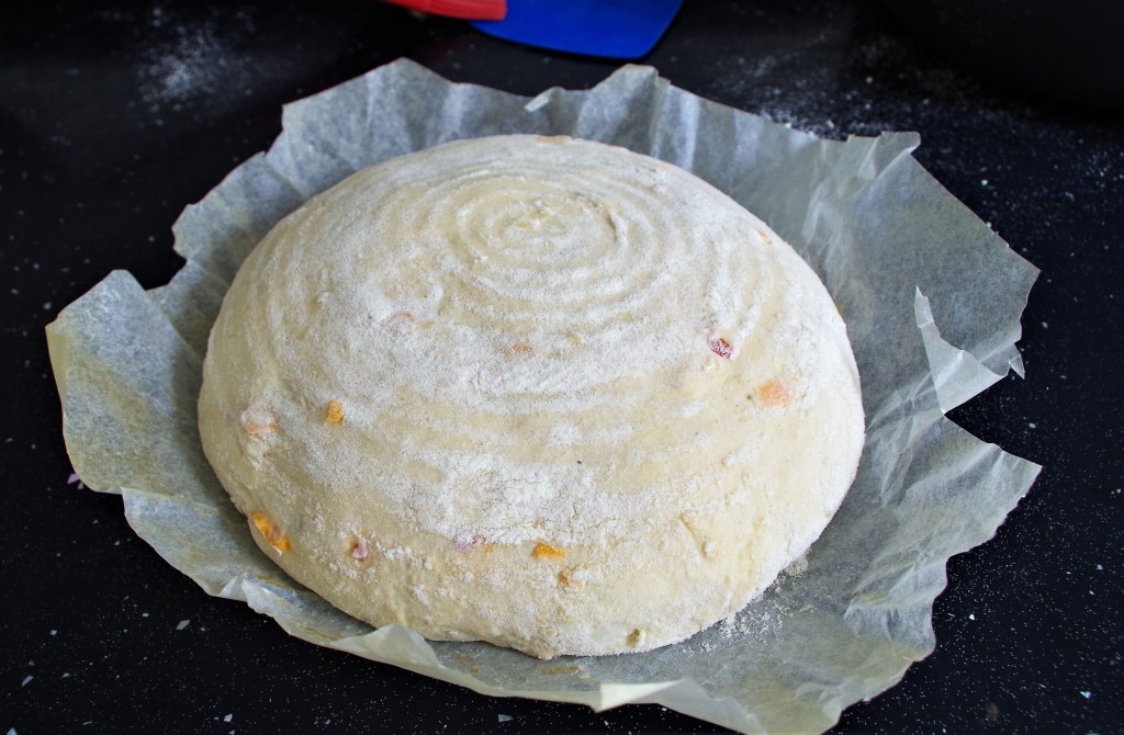2. Day 2 Sometime the following morning (depending on room temperature) tip the risen dough onto a floured surface. Knock it back and spread the dough flat. Smear some of the garlic over then add pieces of pepper and cheese across the surface as evenly as possible, fold over the dough then repeat.