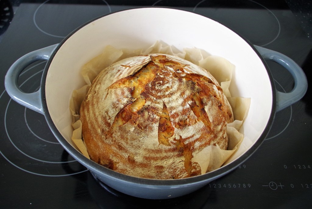 7. Put the lid on the Dutch oven and put it in a normal oven. Turn the oven on to a very high setting (200° – 220°C if possible. 400°F/Gas 6 or higher) and bake for 50 minutes. Remove the lid and bake for a further 10 minutes. (NB This is a “cold start” method, which I like to use.)